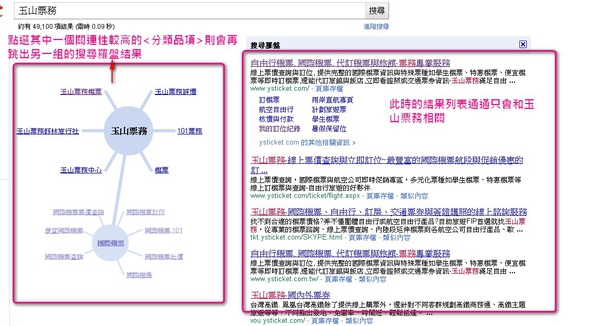 例如 點選玉山票務之後,會跳出新一組的關鍵字搜尋結果,此時右方出現的結果關聯性會更高,