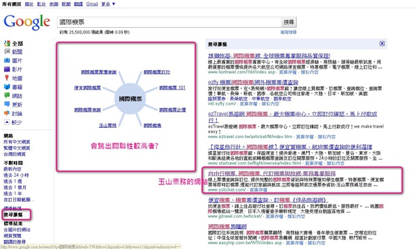 畫面的呈現,是兩欄式的結果排序,中間的結果是與"國際機票"相關的關鍵字詞意組,而右方則仍是維持固有的條列式排序結果。