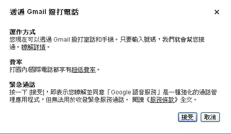 點選<接受>則會跳出 Google Voice的外掛畫面,做相關資訊告知。,如需查詢費率可點此入。
