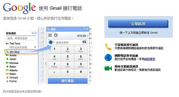 而上周開放38個國家可使用的則是需透過Gmail啟用Google Talk裡的"撥打電話功能",此為需事先儲值(每次的單位是10美元),即可透過此服務撥打國際電話(含手機)與傳簡訊(起參考下圖)。