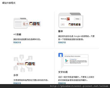 回到正題,小小研究一下,目前Google+的對外開發提供四組不同性質的功能,分別是 『+1按鈕』、『徽章』、『分享』、『文字片段』還在努力了解其中的差異與自己能善用的思考,希望很快就能上手,並跟大家分享。
